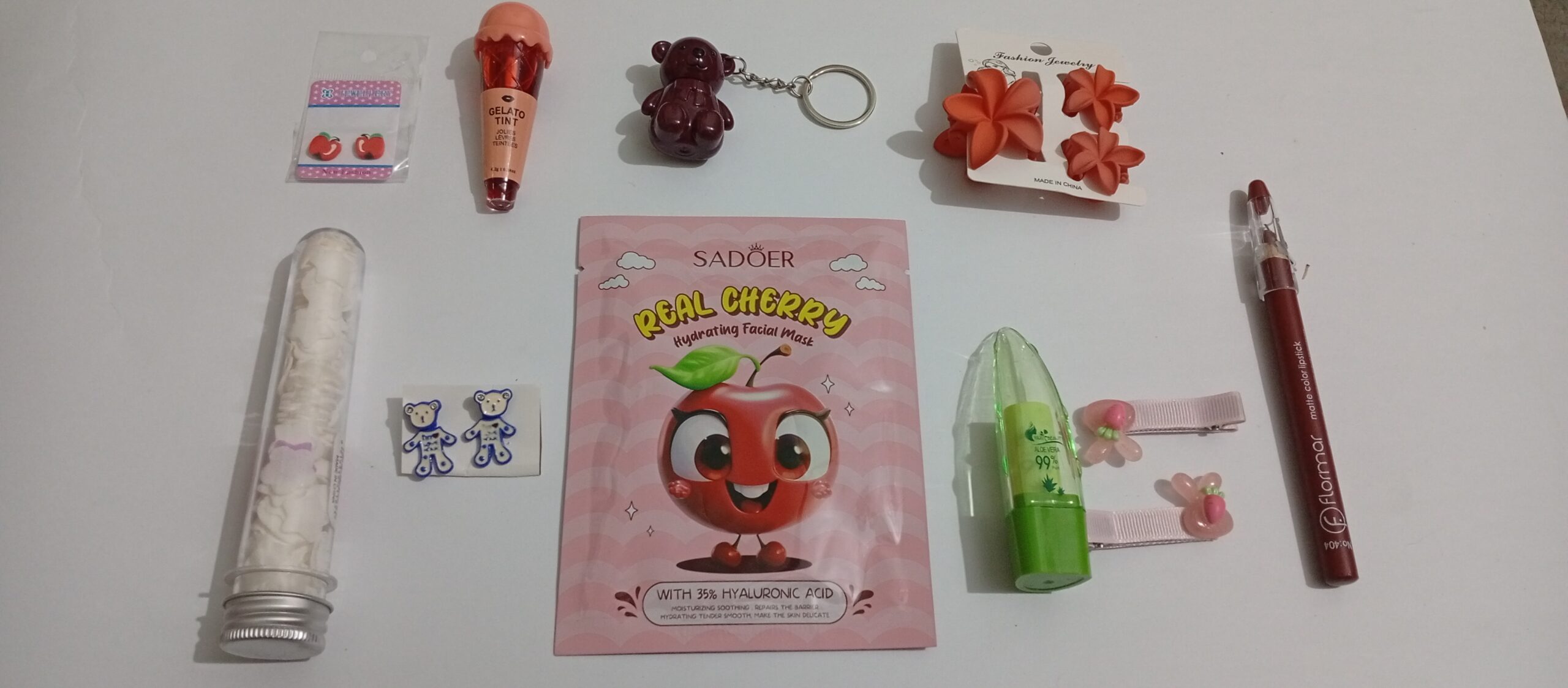 Teddy lip gloss aur gelato tint lips ko soft shiny look dete hain. Sath hi cute hair clips aur teddy ear tops overall appearance ko stylish banate hain.