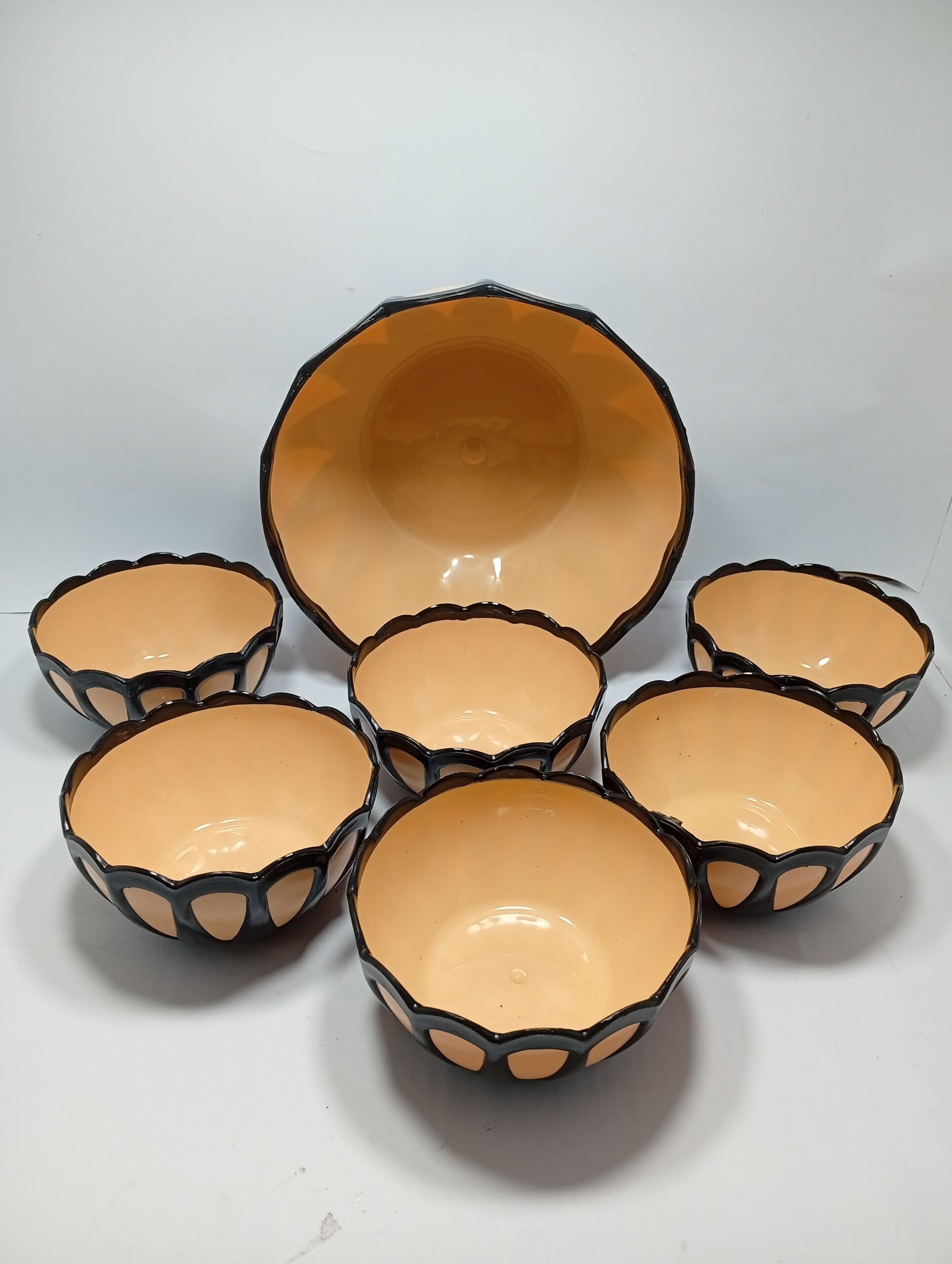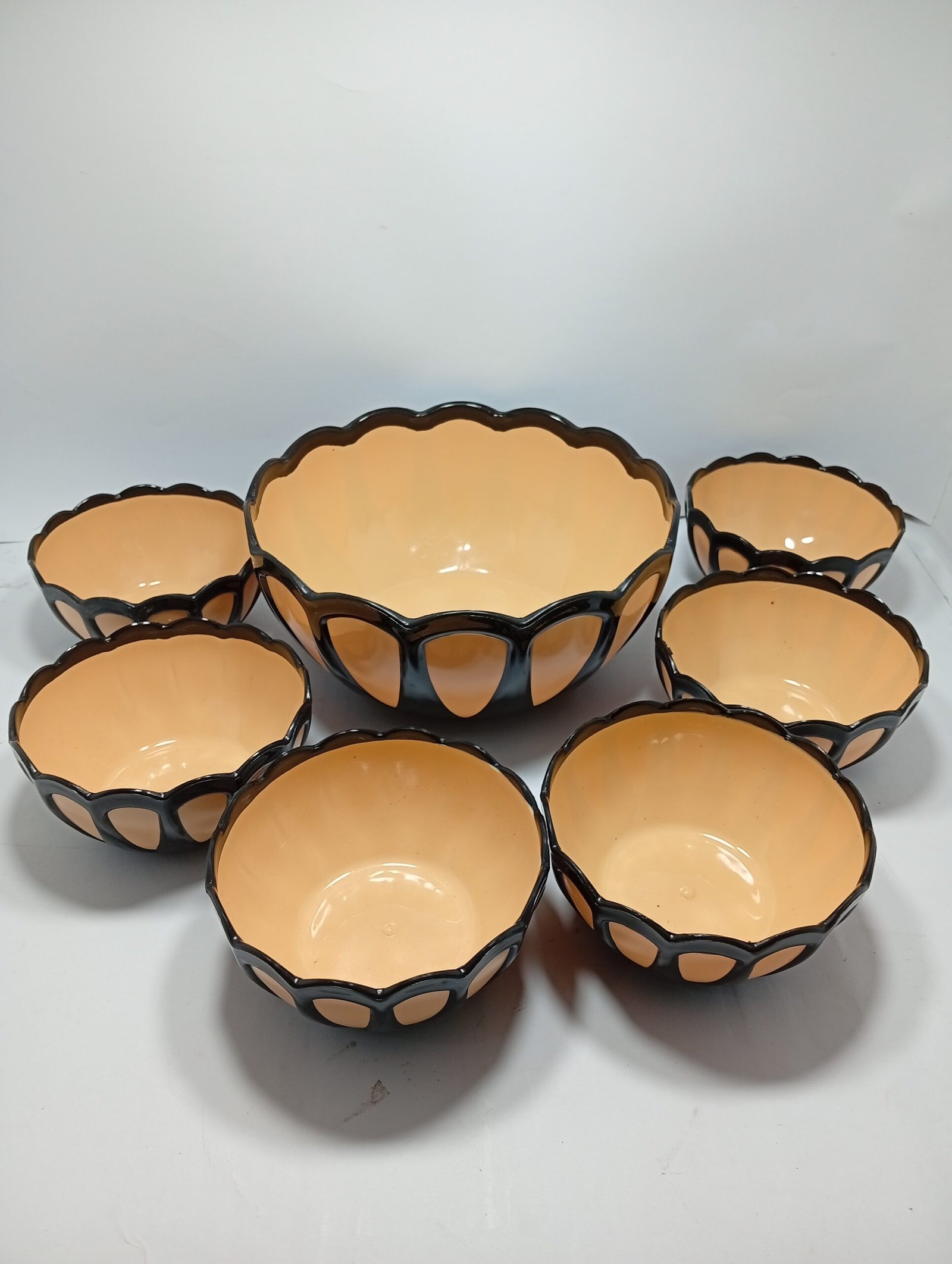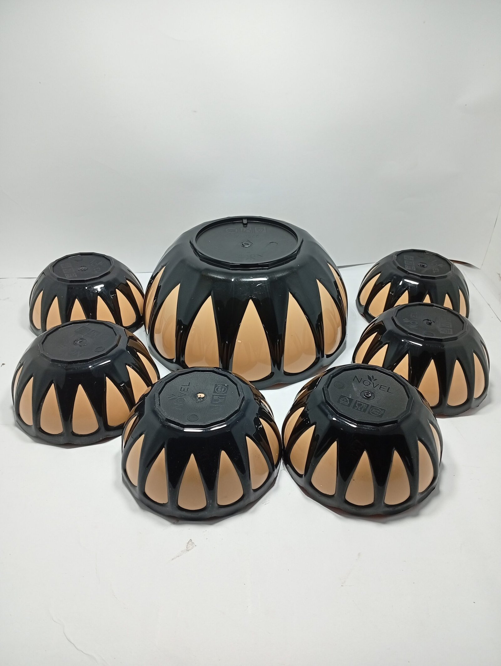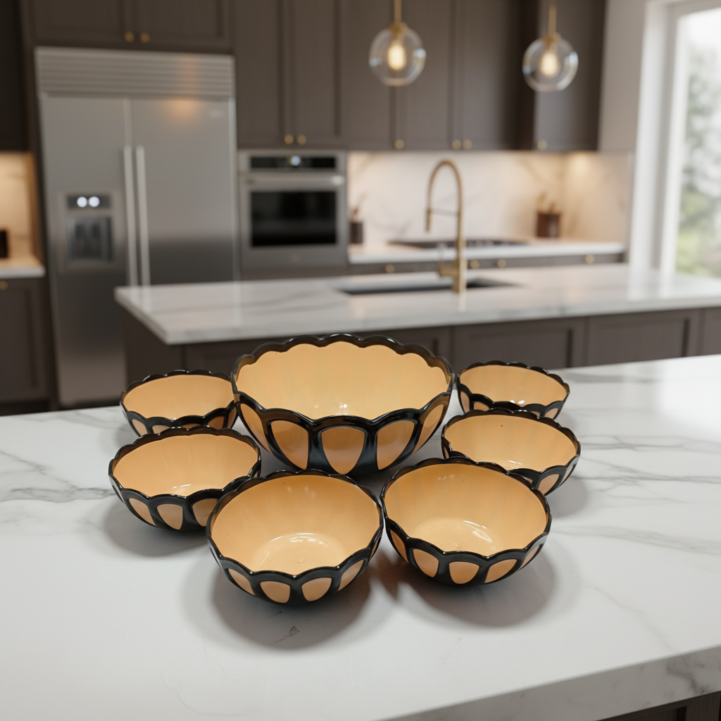 Buy plastic bowl set 7 pieces in black and cream color. Stylish, durable kitchen bowls for daily use in Karachi. Best price & quality.
