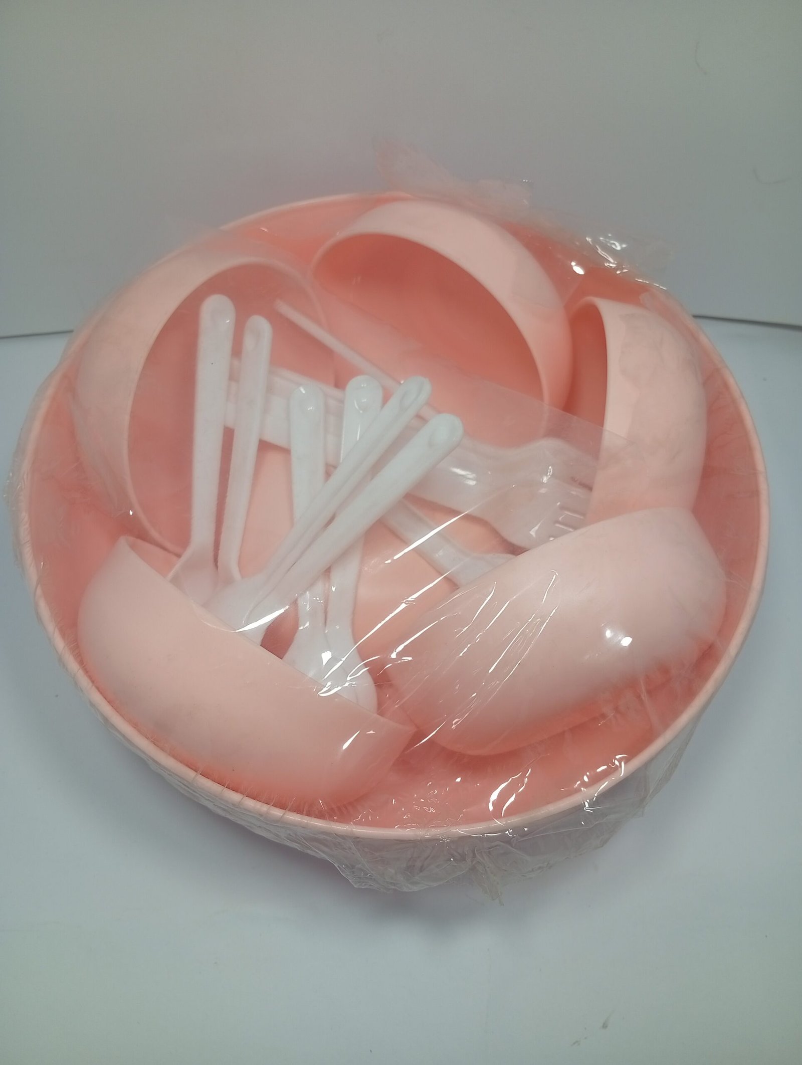 Image se clear hai ke set soft peach / light pink color me hai, smooth finishing ke sath, jo table par clean aur decent look deta hai. Plastic material lightweight hone ke bawajood durable aur reusable hai.