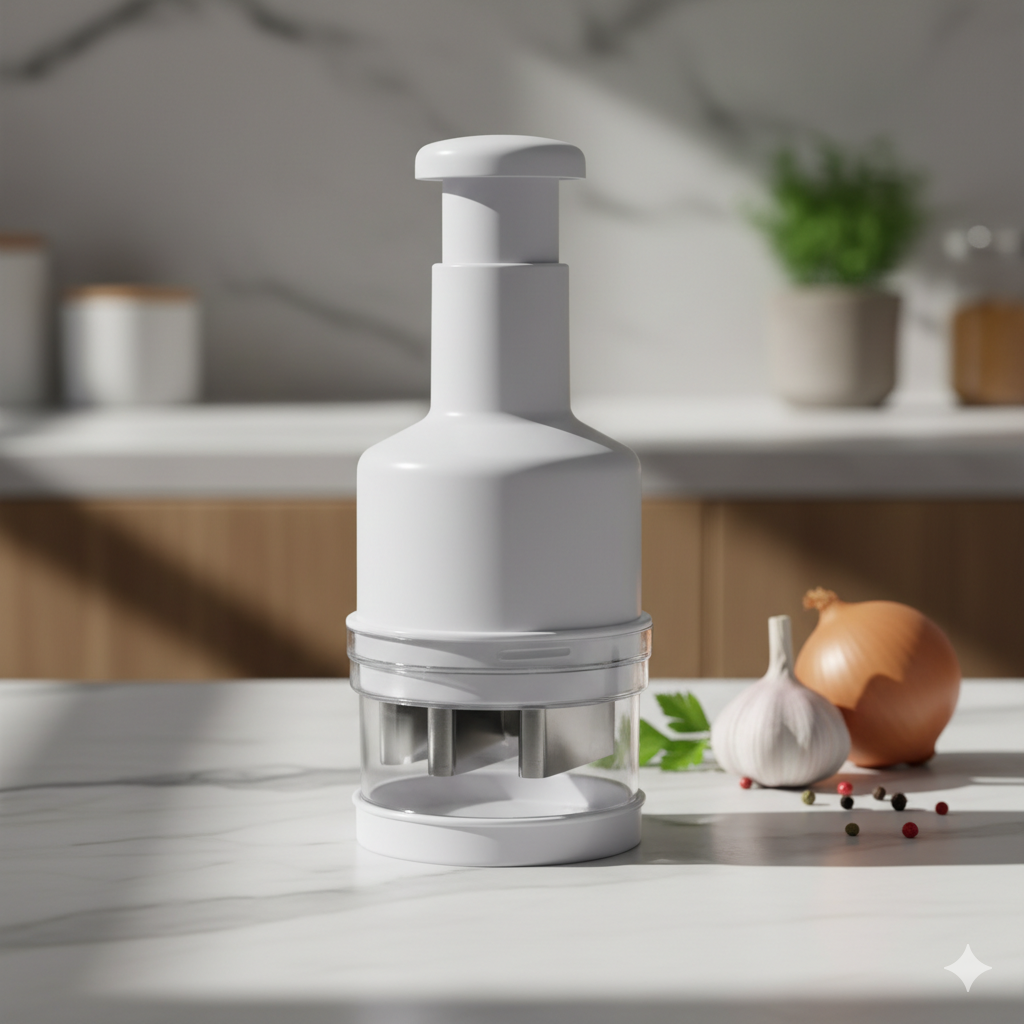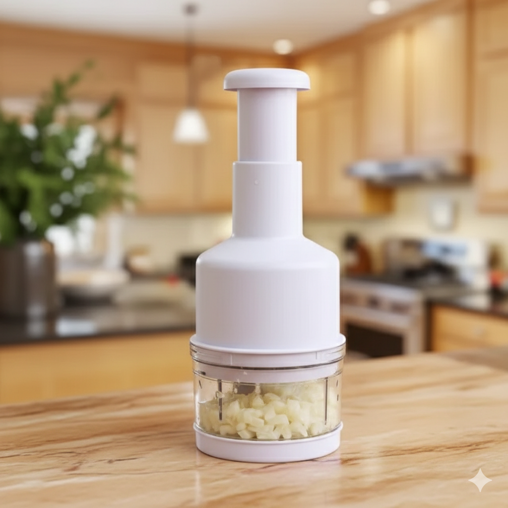 Yeh compact manual kitchen gadget sirf press karne se seconds mein onions, garlic aur choti vegetables ko finely chop kar deta hai. Electricity ki zarurat nahi – bas press karein aur kaam khatam.